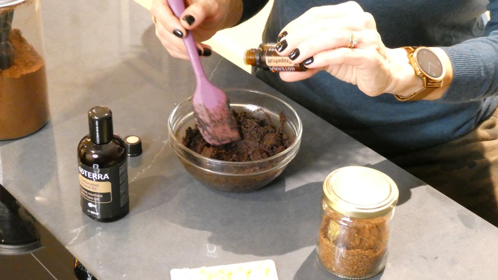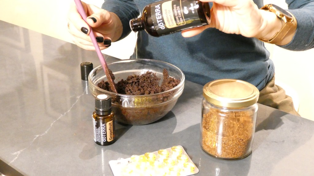 Numa tigela, junte o açúcar e o café, em seguida, acrescente o OE, a vitamina E, e mexa.